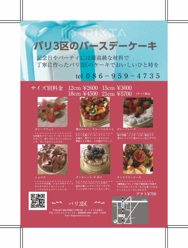 お問合せが多くよせられていました、ホールケーキのカタログができましたのでお知らせさせていただきます。実際にご覧になりたい方は店頭で配布しておりますのでよろしければお立ち寄りください。